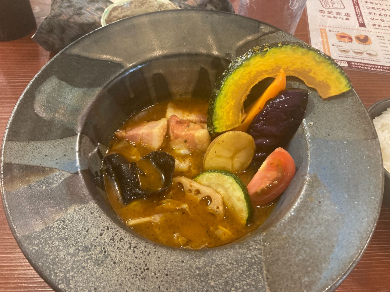 Omdat ik nu al vroeg op het vliegveld ben, is er tijd voor een goede lunch. Ze hebben er een curry-restaurantje. Het vraagt weer even in de rij staan, maar dan kun je bestellen via een self-service scherm. Ik neem voor 1700 yen de bacon curry met rijst. Het is zogenaamde ‘Hokkaido Soup Curry’. Het wordt vers gemaakt met heel veel groente en is heerlijk.