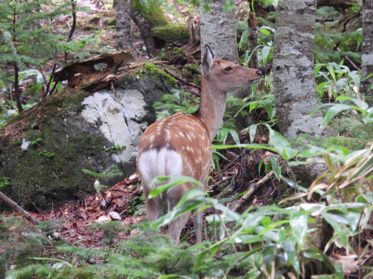 De 3 km lange wandeling volgt grotendeels een pad door het bos, dat af en toe wordt onderbroken voor één van de vijf meren waarnaar de wandeling genoemd is. Verschillende Japanse wandelaars die tegelijkertijd met mij vertrekken, dragen berenbellen, dus dat heeft de beren waarschijnlijk weggejaagd, als ze er al waren. De grafiekjes in de voorbereidingsvideo lieten zien dat in augustus en september ongeveer om de dag beren langs dit pad zijn gezien. Het enig wat ik tegenkwam waren twee herten. Verder was het weinig opwindend.