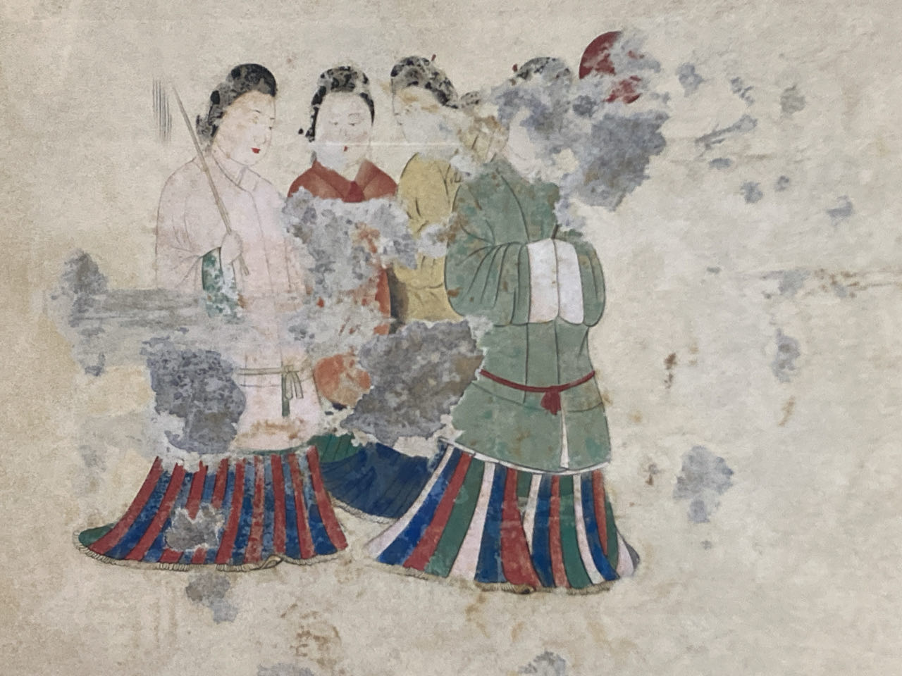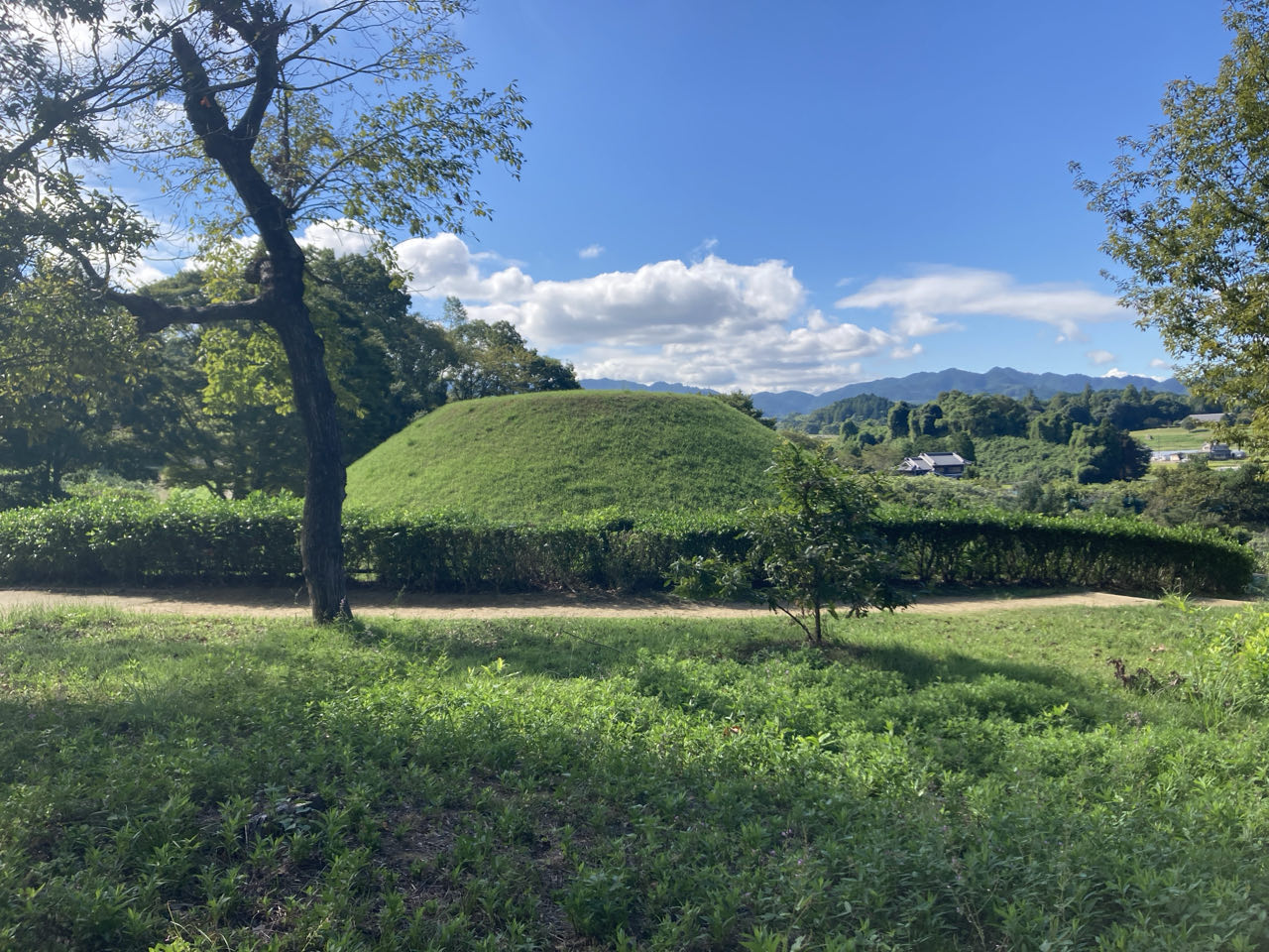 Mijn eerste stop is de Takamatsuzuka Tombe. Dit ligt in een uitgestrekt park, waar ik mijn fiets op een fietsenparkeerplek kan achterlaten. Tombes zoals deze zijn overgroeid, maar in 1983 ontdekte men dat de grafkamer van de Takamatsuzuka tombe bedekt was met muurschilderingen. Deze zijn verwijderd en worden nu geconserveerd. Er is nu een ruimte waar je kopieën er van kunt zien, vooral de sierlijke courtisanes zijn erg mooi.