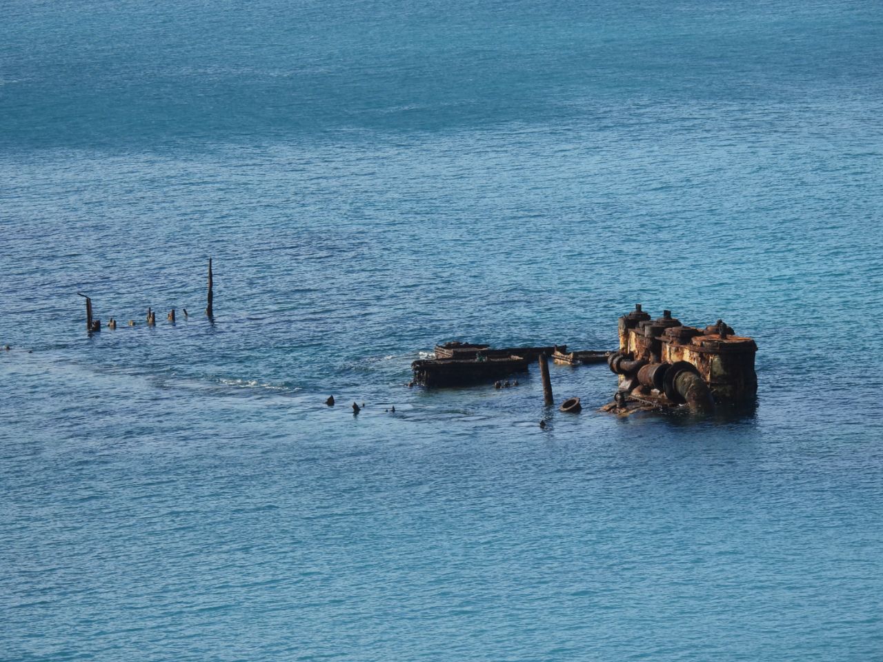 Dit is mijn laatste ochtend in Ogasawara. Ik haal wat bij de supermarkt en eet mijn ontbijt op vanaf een bankje aan de haven. Ik pak weer de eerste bus langs de kustweg, en stap uit bij Sakaiura Beach. Hier ligt in de baai nog een gezonken schip uit de Tweede Wereldoorlog. Er steekt nog net een verroest stukje boven het water uit. Het strand daar is verder niet veel bijzonders.
