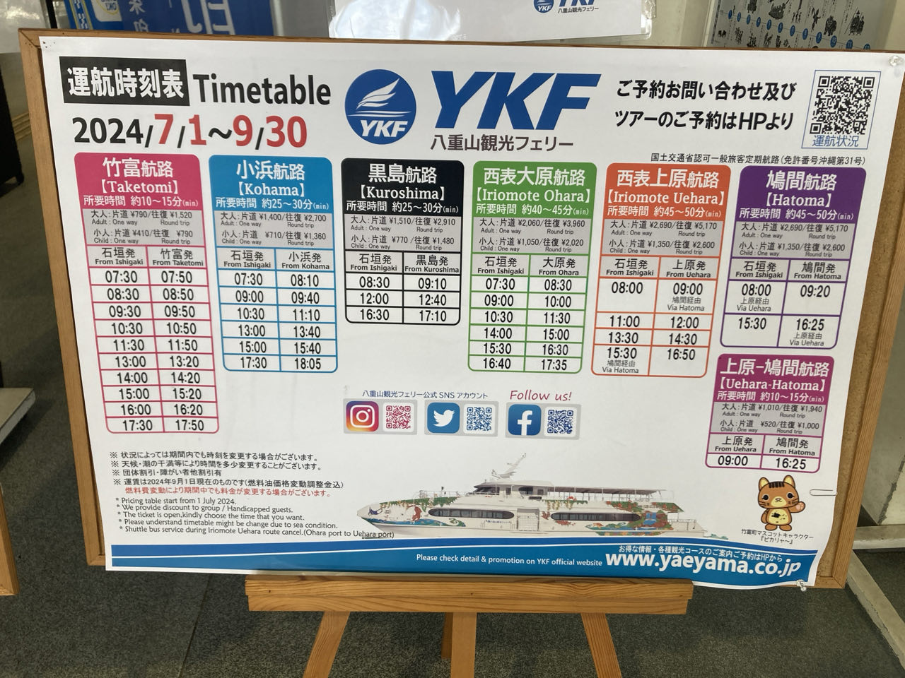 Ik koop mijn kaartje, een retour naar Ohara (een van de twee havens op Iriomote) voor 3960 yen (ca. 25 EUR) bij Yaeyama sightseeing ferry, één van de 2 maatschappijen die een paar keer per dag op Iriomote varen. Net voor vertrek valt er nog een enorme tropische regenbui, maar ik zit gelukkig binnen. Aan boord is het niet druk, er zijn maar een stuk of 30 passagiers. De vaart duurt 45 minuten en verloopt kalm. Iriomote ligt op maar 200 km van Taiwan, dit is echt het verre zuiden van Japan en we varen dan ook langs een basis van de kustwacht.