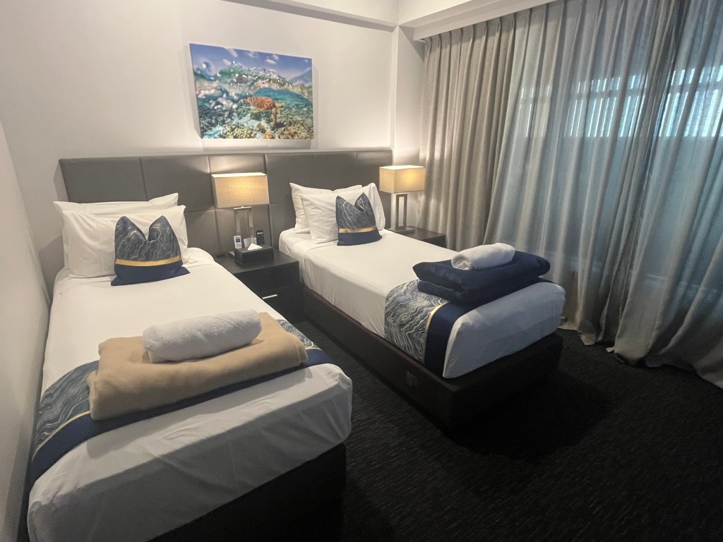 Cairns, Abbott Boutique Hotel: Moderne kamers in een onopvallend gebouw in het centrum. Niet echt een hotel, receptie ‘s nachts niet aanwezig. 105 EUR