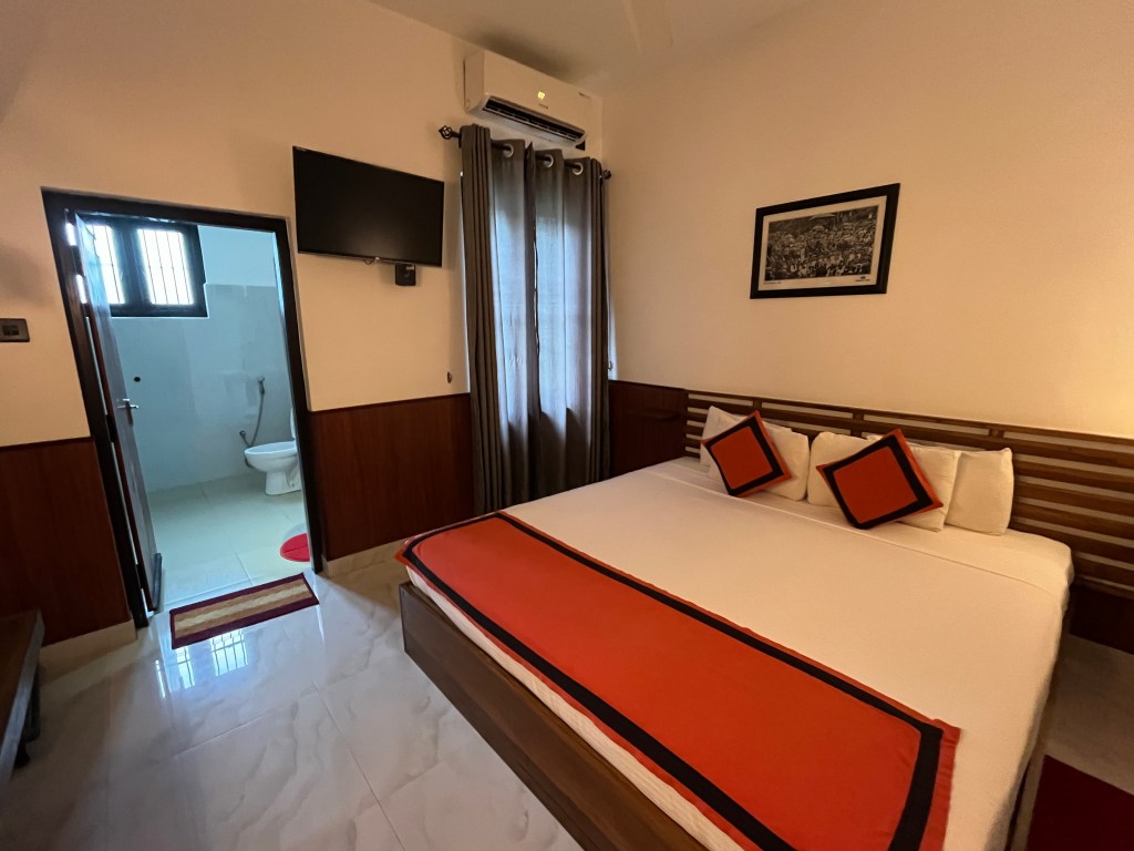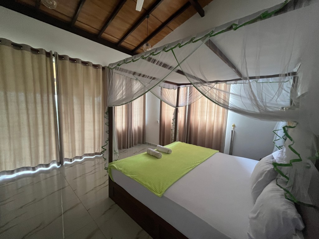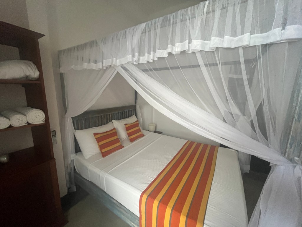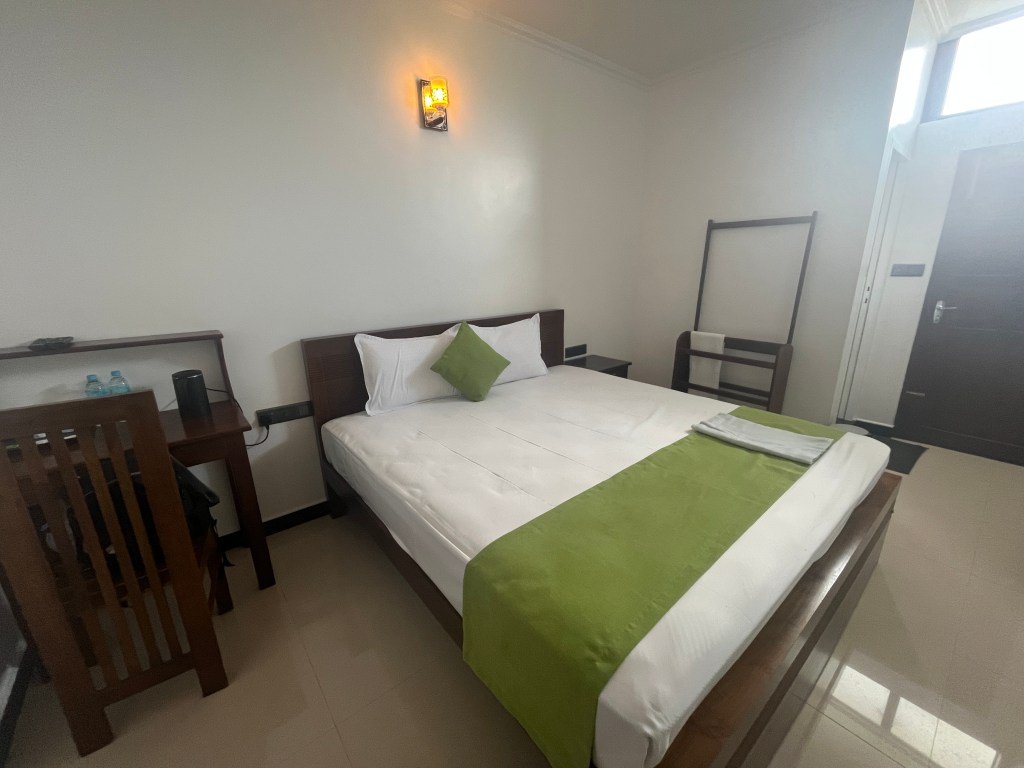 Ik koos mid-budgetaccommodaties om de totale kosten laag te houden en toch een goede nachtrust te hebben zonder last van insecten of erger. Ik betaalde gemiddeld 36 EUR. Wat je daarvoor momenteel in Sri Lanka krijgt, zijn door families gerunde pensions met gemoderniseerde kamers. Ze hadden allemaal goede bedden, airconditioning, wifi (behalve één) en warm water in de badkamer. Sommige hadden ontbijt inbegrepen. Ik zocht naar een beoordeling van 8 of hoger op Booking.com en heb vervolgens de recensies over hygiëne nauwkeurig bekeken. Ik kan ze allemaal aanbevelen.