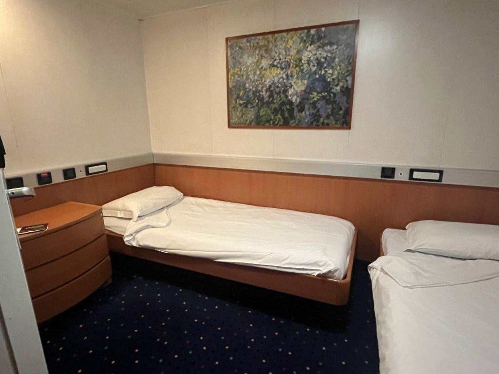 Hut op veerboot naar Olbia: Eenvoudig maar netjes. Eigen badkamer. Ca. 60 EUR.