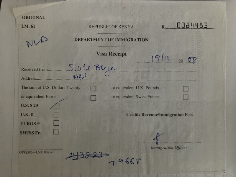 2008 (December): Entered at Nairobi Airport, stayed overnight and drove southward to the Tanzania border the next day.